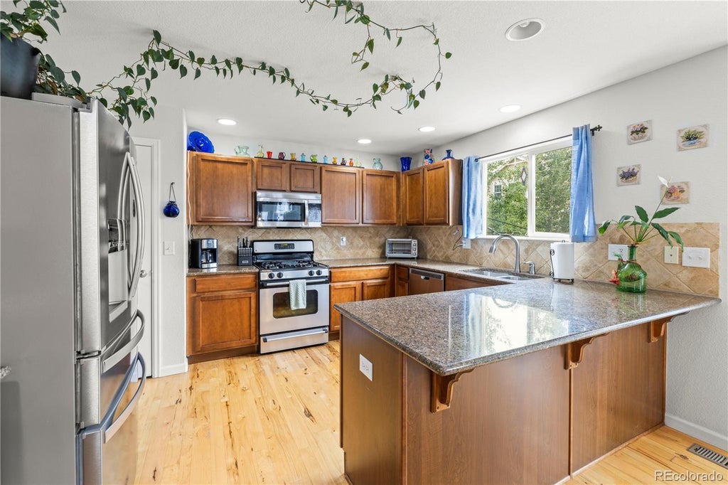 $16k PRICE IMPROVEMENT! Amazing home right across the street from Pioneer Ridge Elementary School and playground. Big updates, big value! Brand-new roof, furnace, and new appliances mean fewer expenses and more confidence for the next owner. Two-stories, vaulted ceilings, hickory floors, open floor plan, and an expansive living space with 2 kitchens! There’s plenty of space in this 4 bedroom 4 bathroom home to set up a WFH office, and on those sunny Colorado days head outside with your laptop to the serenity of your garden. This warm and inviting home draws you into cozy up next to the fireplace in the living room or soak up the sunshine from your bay windows. Built-in home speakers make this home perfect for entertaining, you and your guests can gather in your gourmet kitchen around the island, or head out to your backyard oasis complete with pergola! This home is move-in ready with new carpet, interior paint, maple kitchen cabinets, stainless steel appliances and granite countertops. The finished lower level unit offers a flexible layout with a bedroom, bathroom, oversized living room, and full kitchen with a dishwasher — perfect for additional rental income, house hacking, growing families, entertaining, or weekend guests. End the day in your spacious primary bedroom next to your 2nd fireplace, or take a soak in your 5-piece tub, and walk-in closet. The attached oversized three-car garage has plenty of room for your projects + outdoor toys. Great location in a quiet neighborhood, and the perfect place to relax, entertain + enjoy everything you love about living in Colorado.